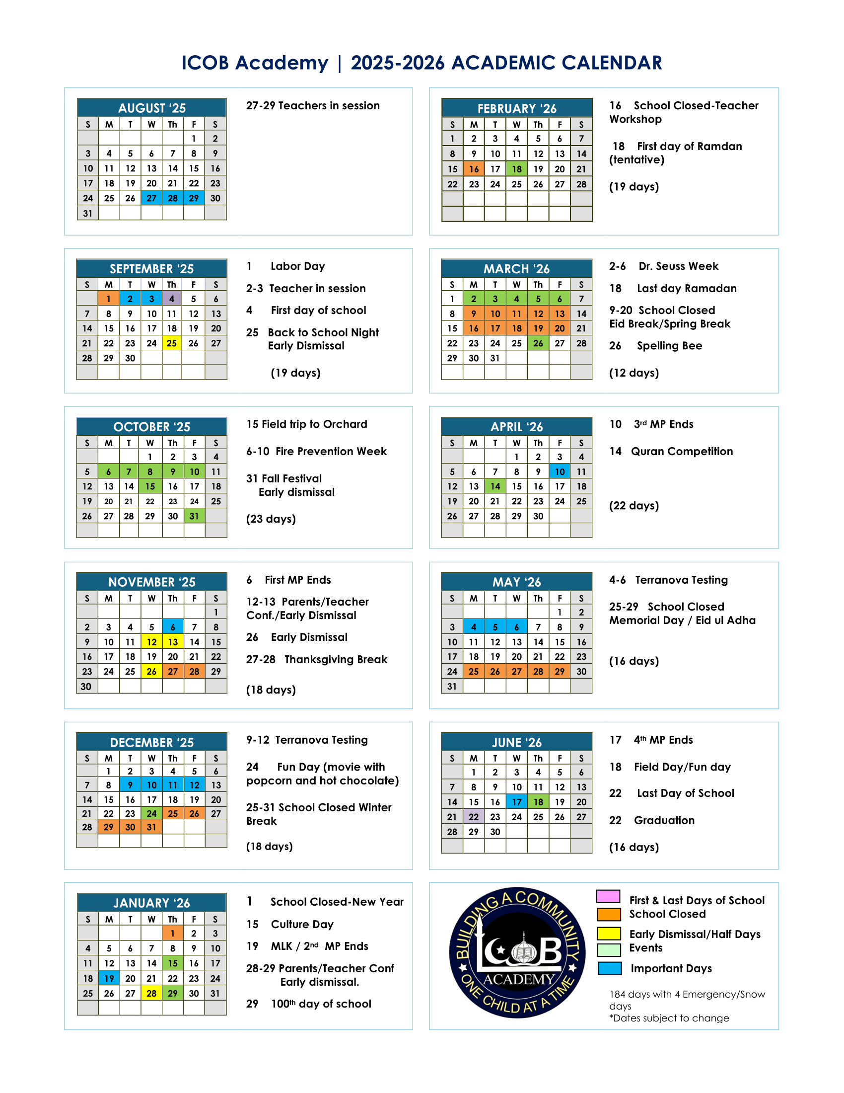 Academic Calendar Click here to download the 2025-2026 school calendar. Contact Us Email: office@icobacademy.orgPhone: (732) 583-2031Hours: Mon - Fri, 8:30 AM - 3 PM Follow Us